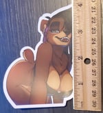 Permanent, single vinyl sticker. Weatherproof, smooth surface with matte finish. 3" W x 2.25" H roughly.