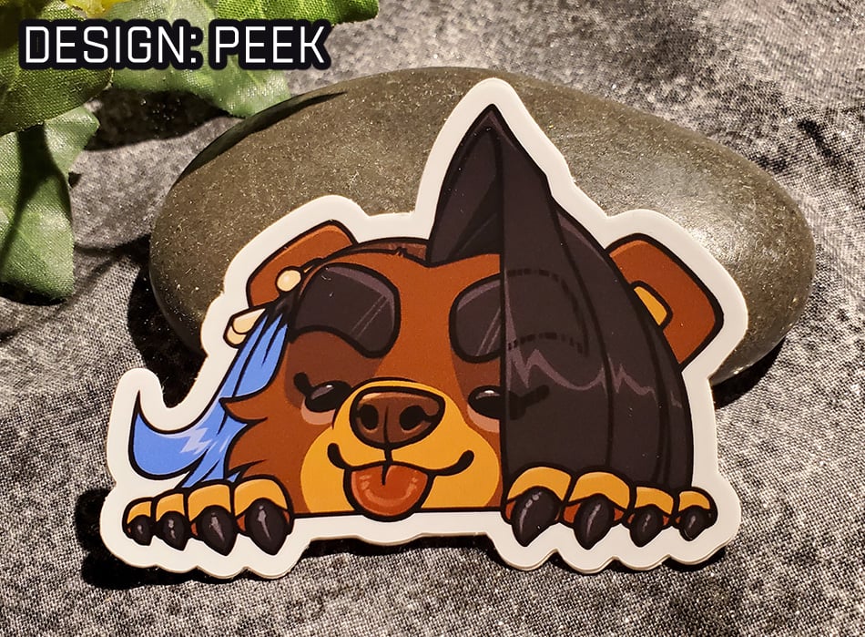Permanent, single vinyl sticker. Weatherproof, smooth surface with matte finish. 3" W x 2.25" H roughly.