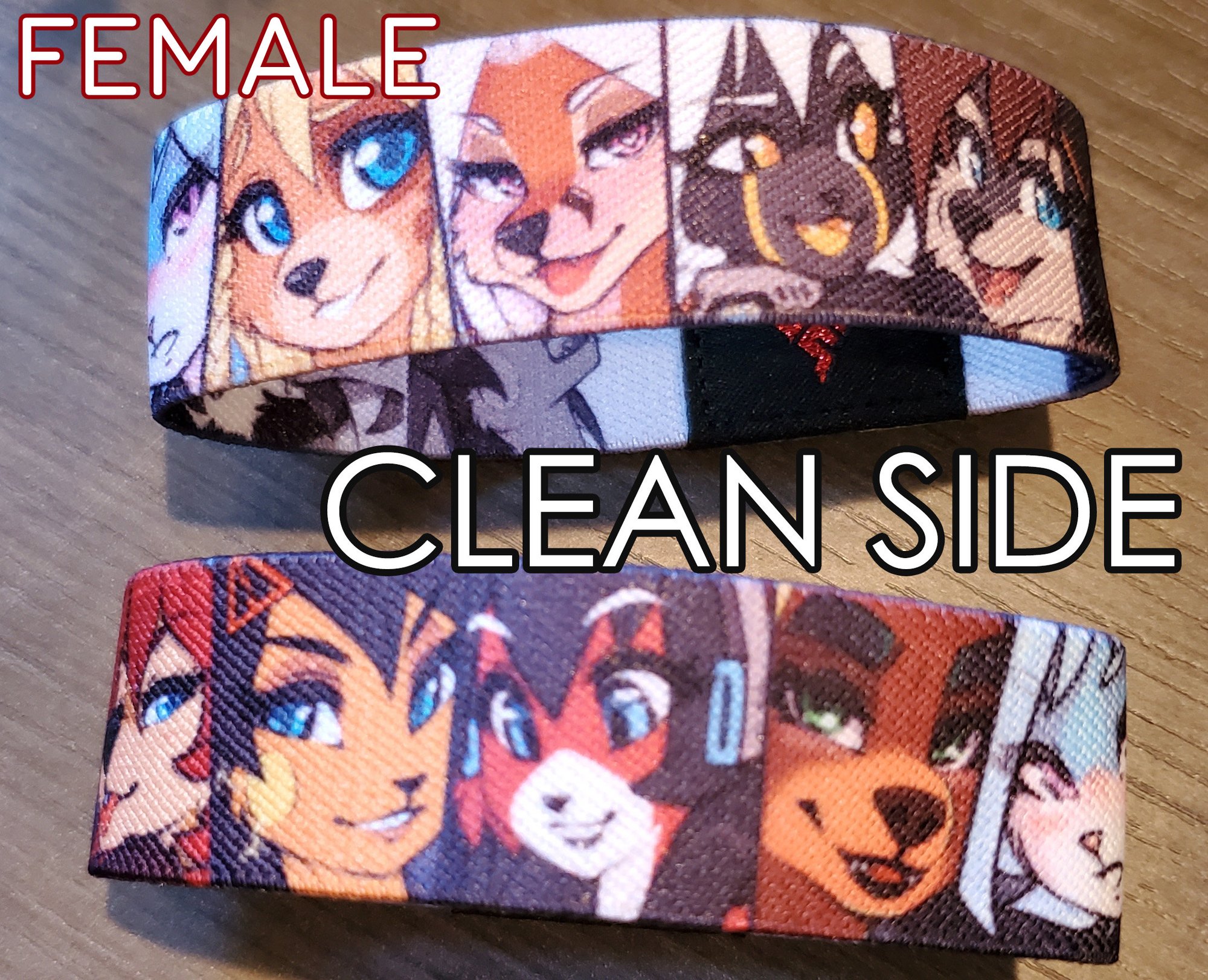 This is a one-size soft elastic wristband printed with designs on BOTH sides and the ability to reverse said sides to display either design. The patterns on this wristband are of my characters, one side with their normal/Clean faces, and on another side with 'Ahegao' faces.