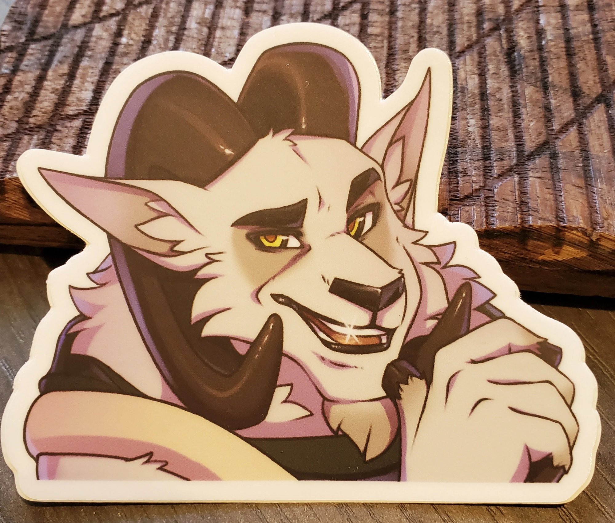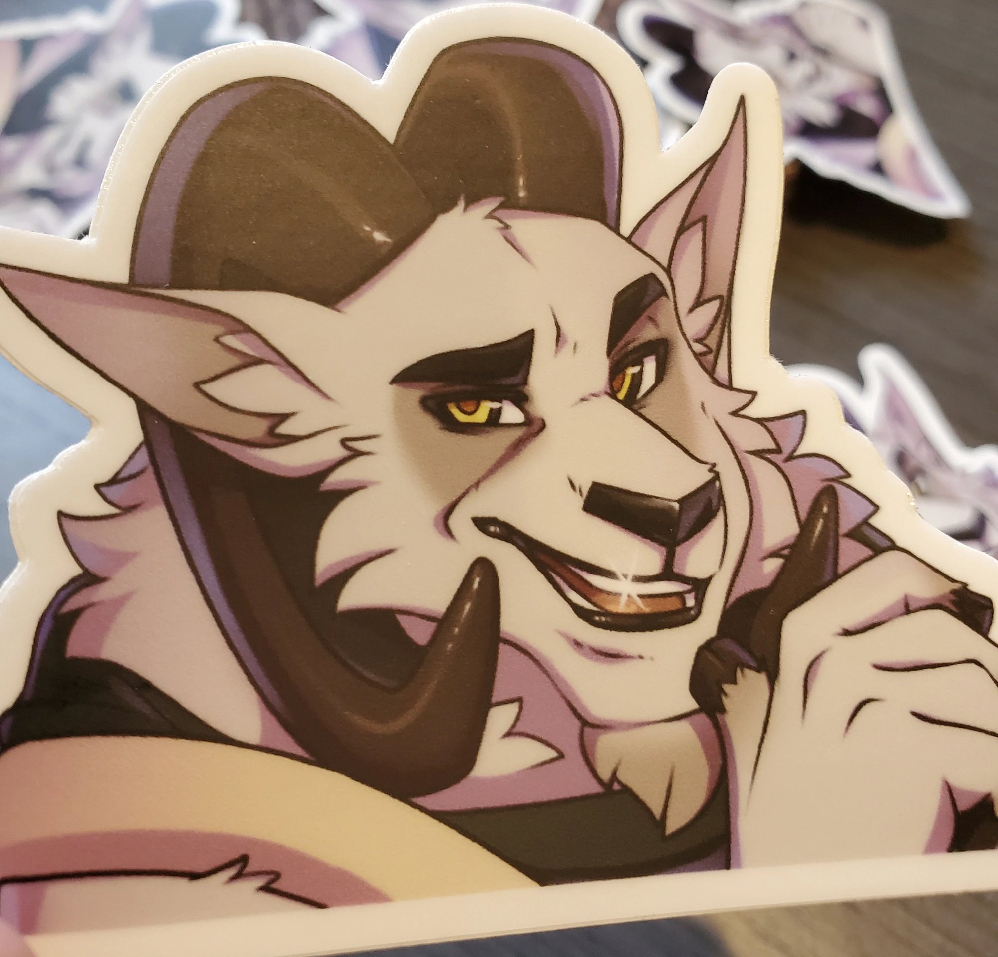 Small die-cut sticker of my mountain sheep OC, 'Massak'.